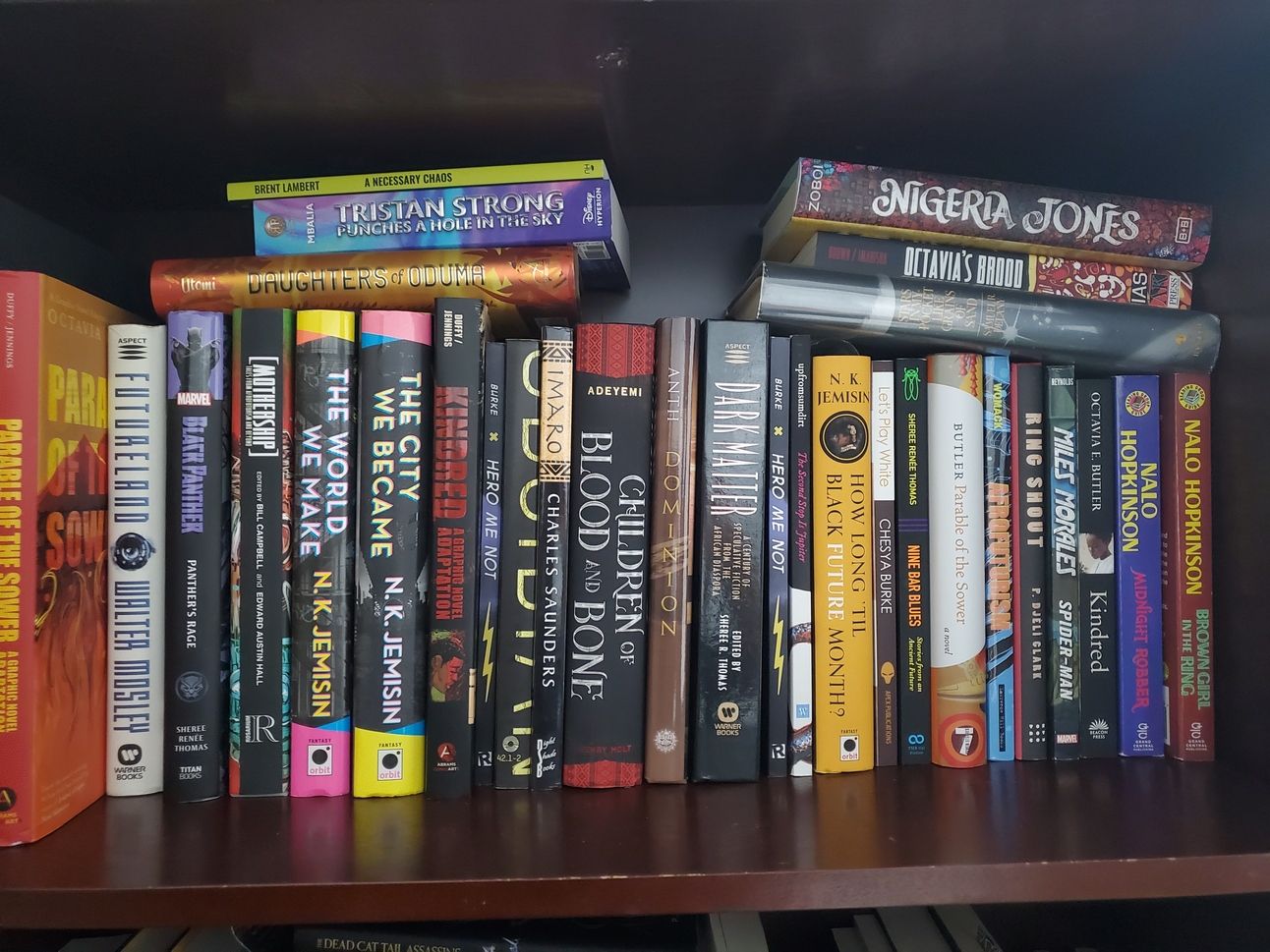 The why I do what I do shelf. This is the shelf of books that have inspired me or push me to do what I do. Futureland (Walter Mosley) was the first book that made me re-think my writing trajectory. When I read it, I thought to myself "we can do that?" It was the first sf book I read that had characters who looked like me, that had worldbuilding done through a different cultural lens. Then I went on a deep dive, discovering Octavia Butler and Nalo Hopkinson. These days having my writing pushed by folks like N.K. Jemisin, Dr. Chesya Burke, and Sheree Renee Thomas. Anything I write I know has to sit alongside them, so I'm always pushing and learning and growing.