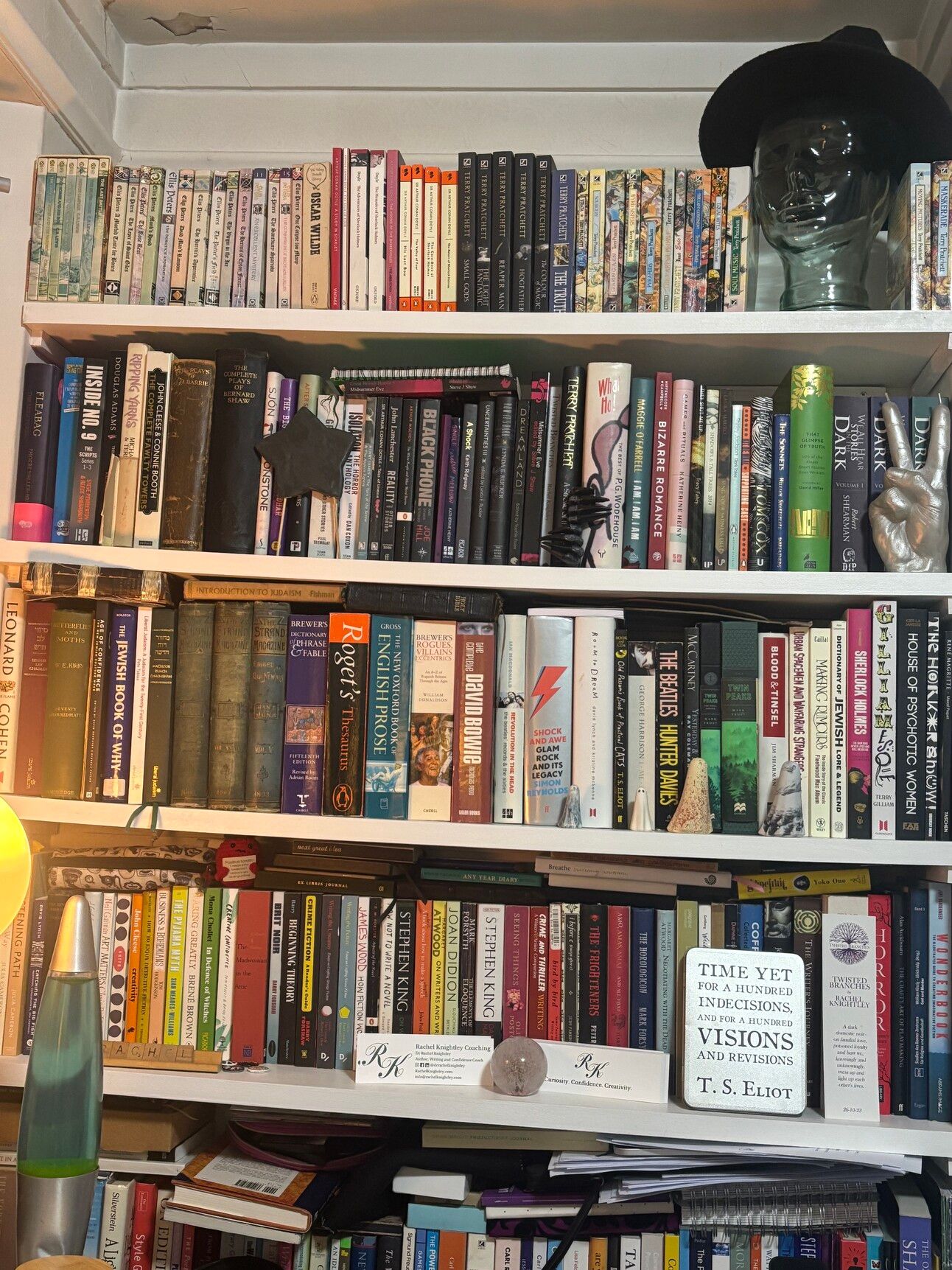 There’s a Holy of Holies shelf for each stack in the living room: on this one you can see a few of my Discworld, Holmes, Cadfael and Chronicles of Narnia paperbacks nesting around the glass head that’s wearing one of my (arguably too many) hats. Then there are the key short story collections (including memoirs, short story cycles &c) that own the shelf below: Audrey Niffenegger’s Bizarre Romance, Maggie O’Farrell’s I Am, I Am, I Am, Robert Shearman’s We All Hear Stories in the Dark, John Lanchester’s Reality and Other Stories, Tom Cox’s Help The Witch. I put my short story cycle Twisted Branches there too, because all of these favourites are reminders our goal as writers is to be fully curious, fully present, fully strange. Welcome the whole of ourselves to the party. To keep exploring further.